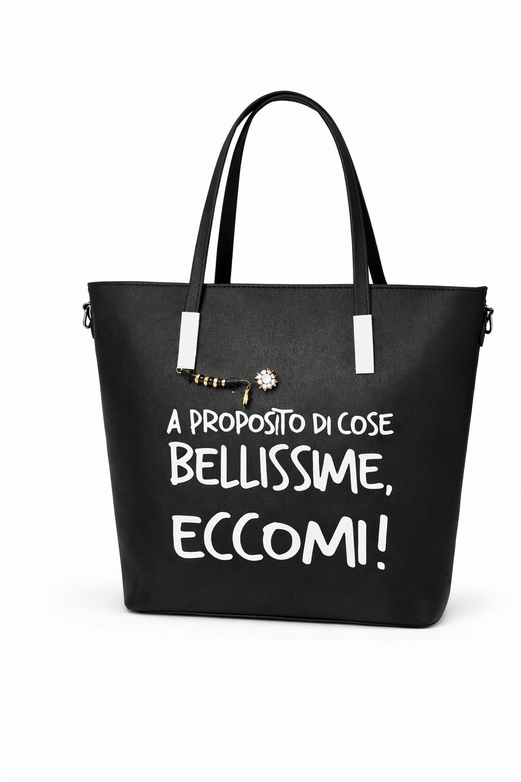 Borsa in ecopelle nera personalizzata con stampa a caldo arricchita da una maxi spilla da balia gioiello. Manici in ecopelle nera.
