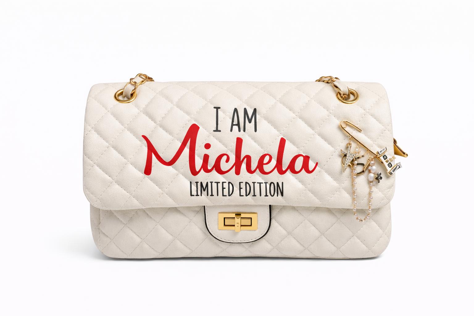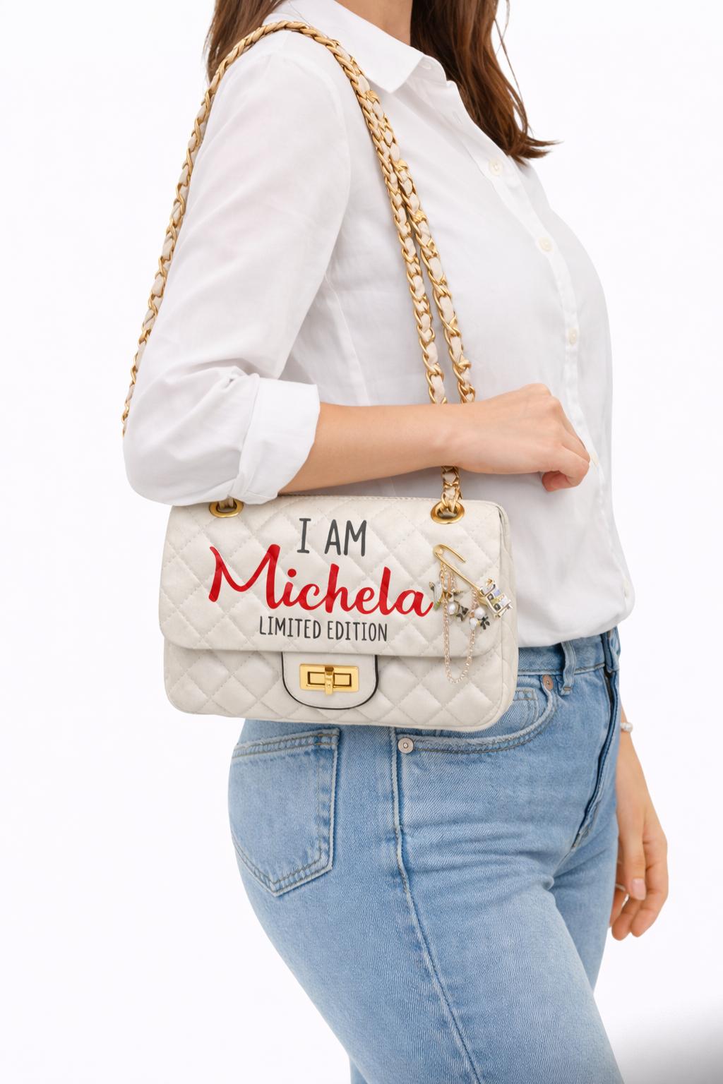 Borsa in ecopelle Limited Edition con stampa a caldo. E’ possibile personalizzare il nome. Disponibile nei colori beige, nero e bianco. Tracolla in ecopelle e catena in oro. Dotata di maxi spilla da balia gioiello.