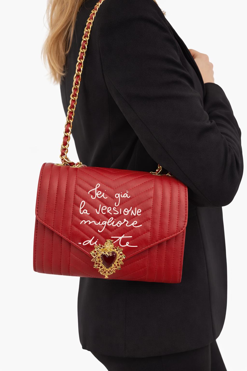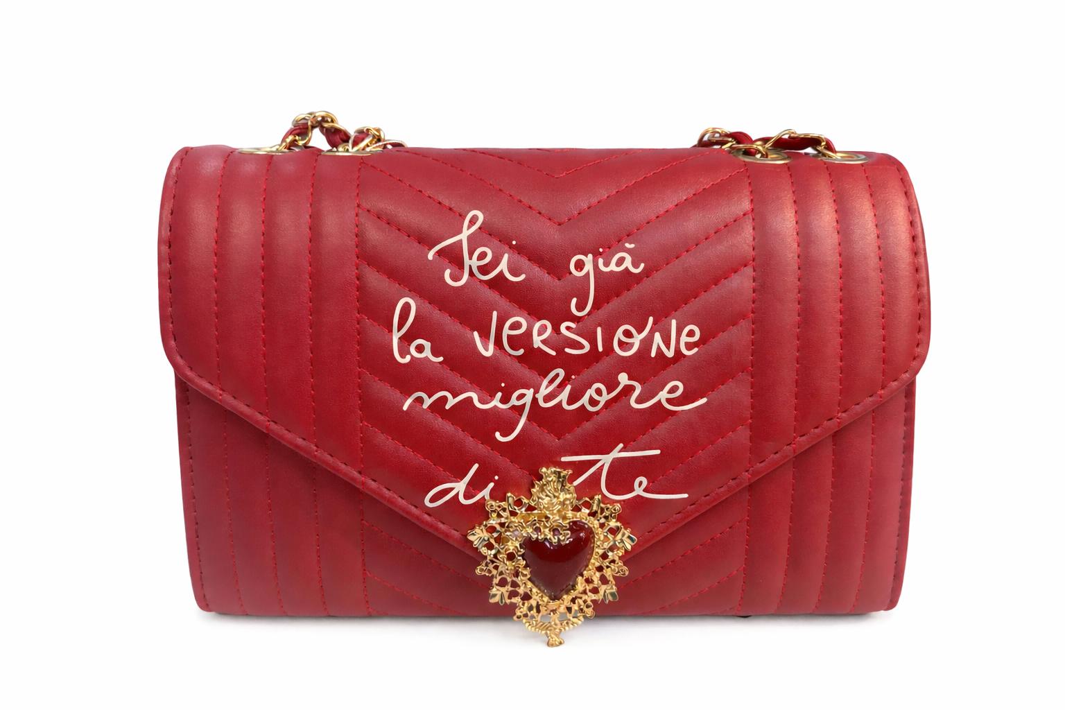 Borsa in ecopelle rossa personalizzata con stampa a caldo e chiusura con sacro cuore in oro. Catena con dettagli in ecopelle e oro.