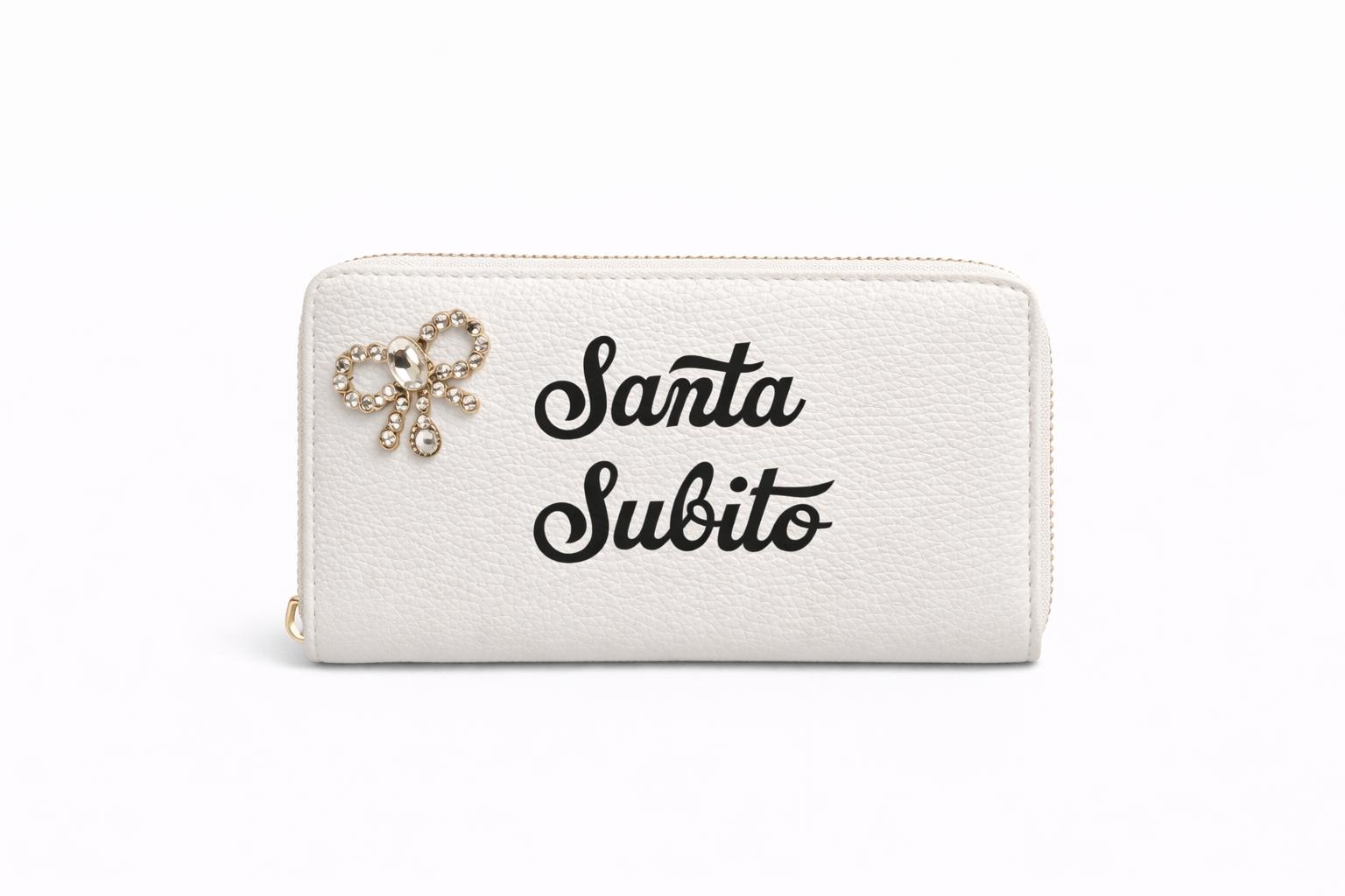 Portafoglio bianco in vera pelle con stampa a caldo “Santa Subito” e spilla gioiello in dotazione. Modello ad una zip con dettagli color oro.